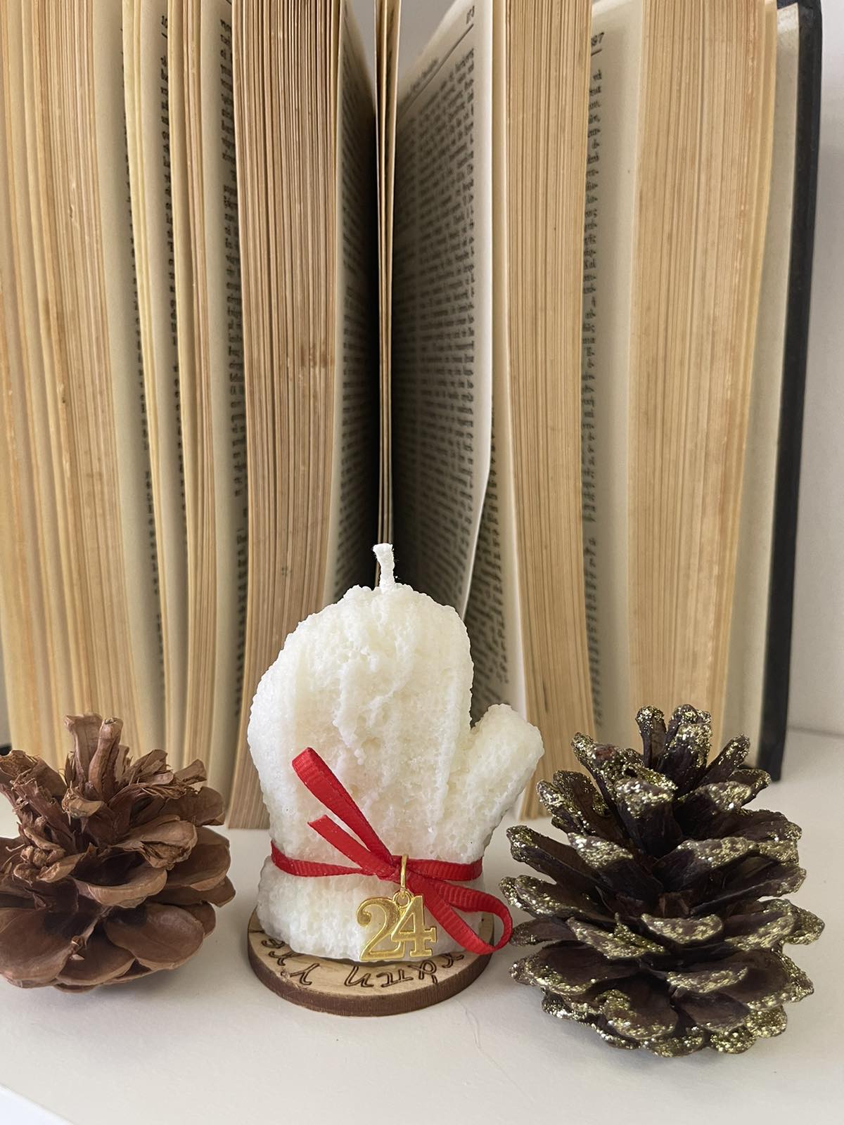 Χριστουγεννιάτικο φυτικό κερί σόγιας με άρωμα μελομακάρονο σε σχήμα γαντάκι ύψος 7 εκ σε λευκό χρώμα