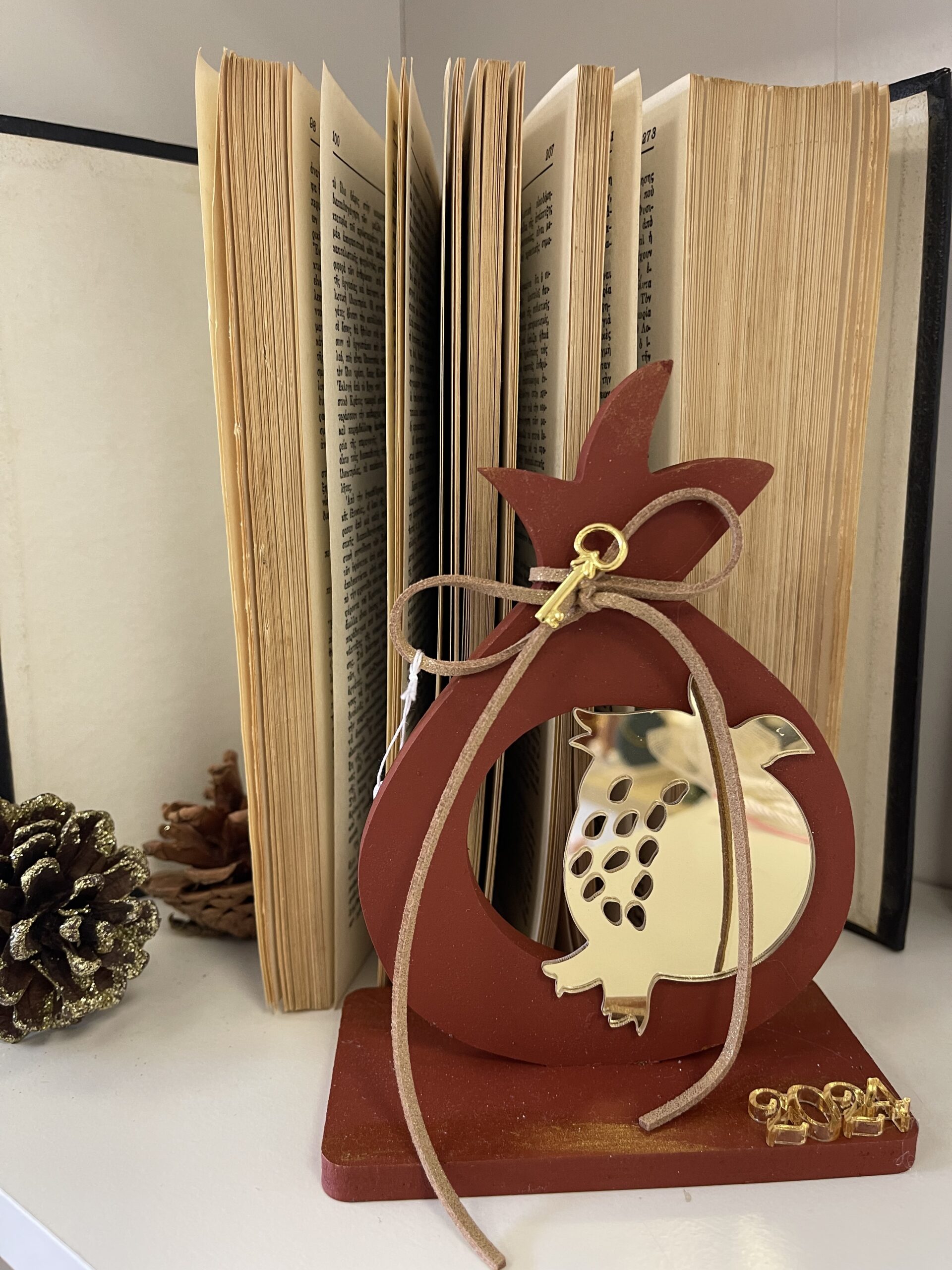 Ξύλινη κατασκευή σε σχήμα ρόδι σε κεραμίδι χρώμα με plexiglass χρυσό ρόδι 15Χ11