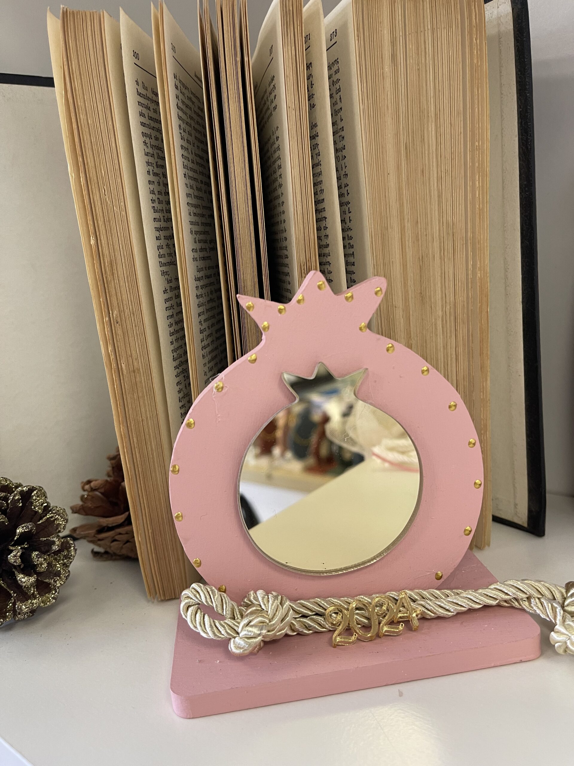 Ξύλινη κατασκευή σε σχήμα ρόδι σε ροζ χρώμα με plexiglass χρυσό ρόδι 12Χ12