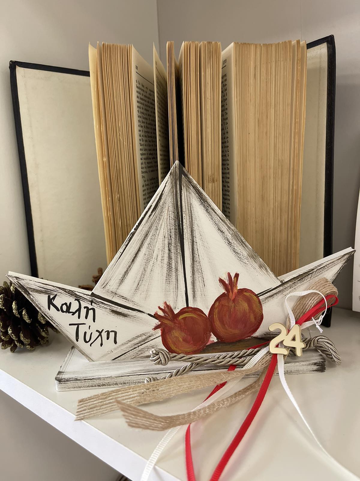 Ξύλινο καράβι ζωγραφισμένο στο χέρι με ρόδια και ευχές