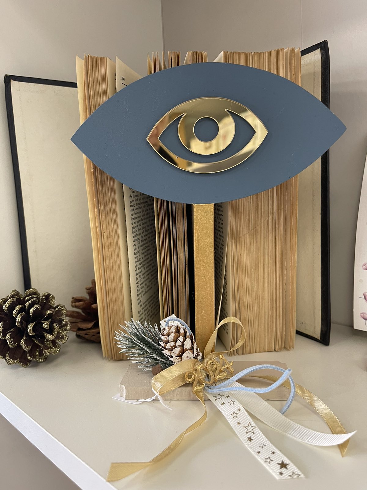 Ξύλινη κατασκευή σε σχήμα ματI σε χρώμα γκρί με plexiglass χρυσό μάτι. 20Χ16